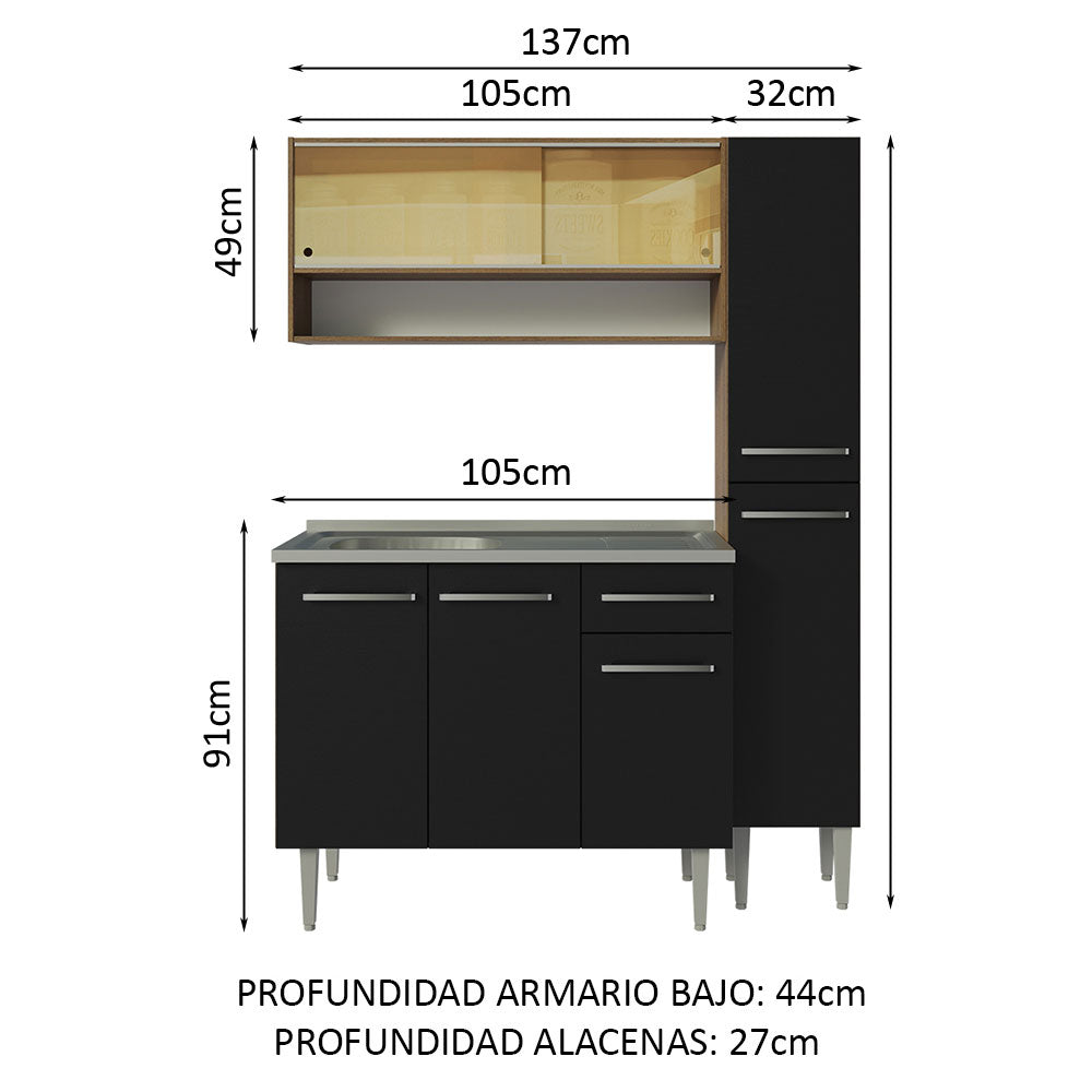 Medidas totales: 137 cm de ancho 186 cm de alto 44 cm de profundidad en el Gabinete bajo y 27 cm de profundidad en el mueble superior y en el despensero vertical.