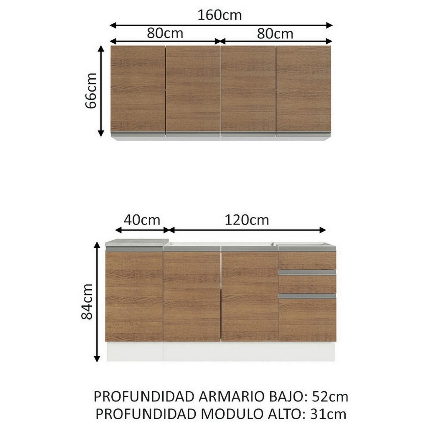 -Altura: 84 cm en los módulos bajos y 66 cm en las gabinetes superiores