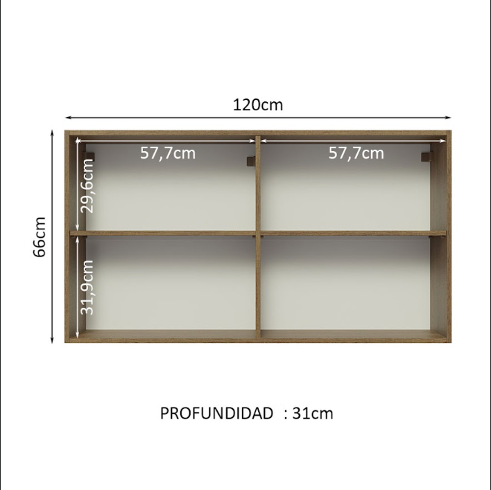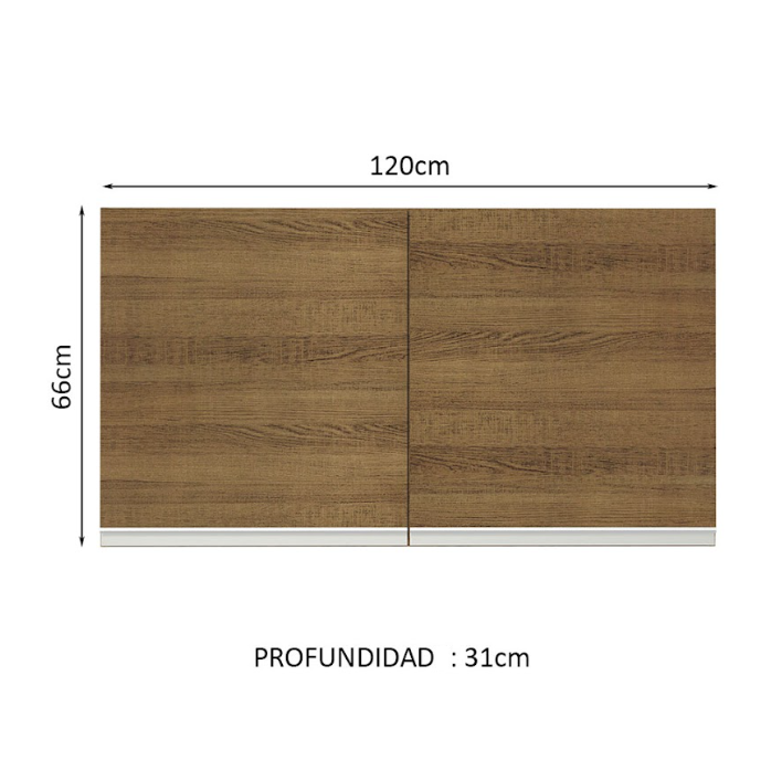 - Un (1) Gabinete Superior de Pared de 66 cm de altura x 120 cm de ancho x 31 cm de profundidad con dos (2) puertas y dos (2) estantes internos.