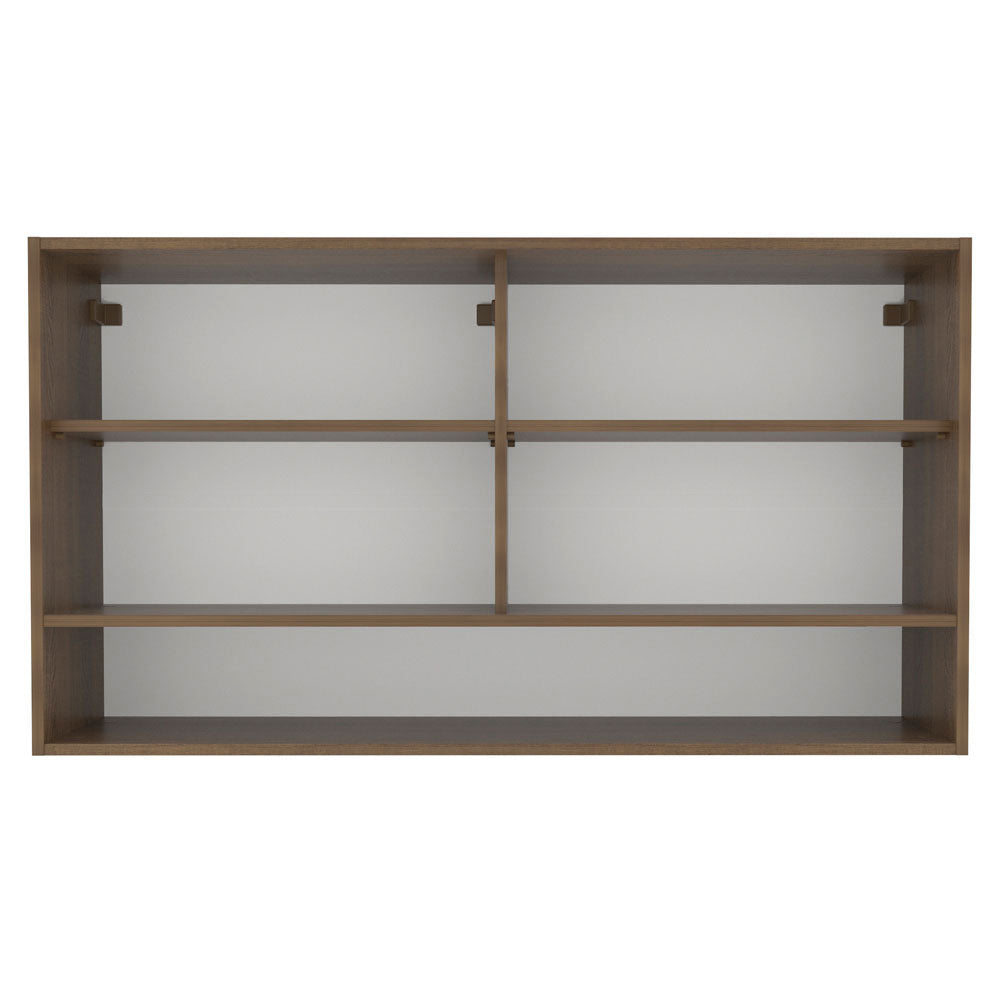 - Un (1) Gabinete Superior con dimensiones de 66 cm de altura x 120 cm de ancho x 30 cm de profundidad, con dos (2) puertas en vidrio reflejante, dos (2) estantes internos y un (1) nicho abierto.