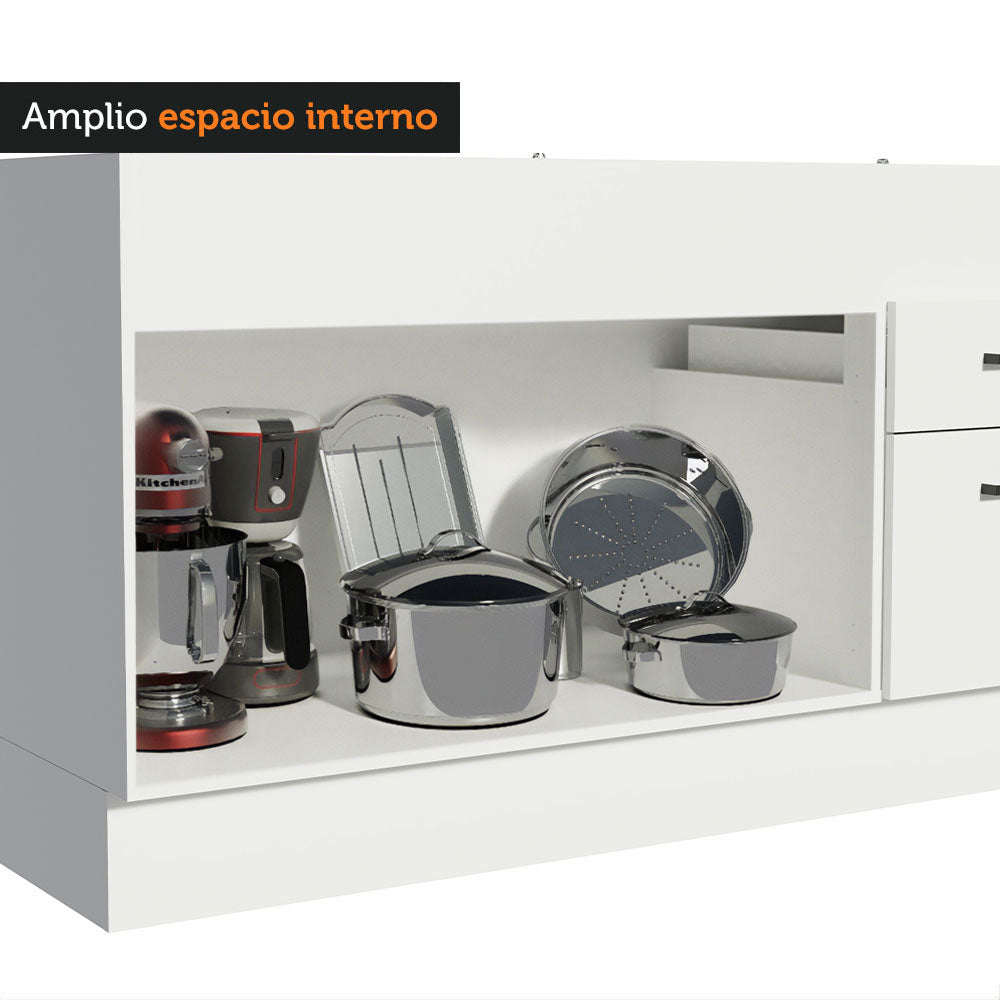 Debido a su gran tamaño, el mueble puede acomodar sartenes, utensilios, platos, cubiertos y mucho más de forma organizada. El espacio para colocar una encimera o tarjas de acero inoxidable o de piedra es de 150 cm de ancho x 52 cm de fondo. (No incluye la tarja ni la encimera)