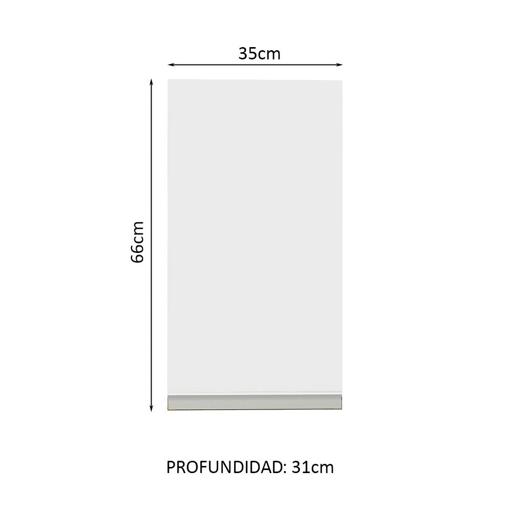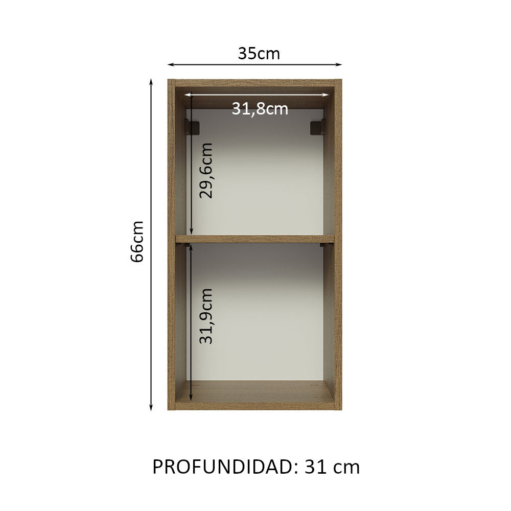 - Un (1) Gabinete Superior de 66 cm de alto x 35 cm de ancho x 31 cm de fondo con una (1) puerta y un (1) estante interior.