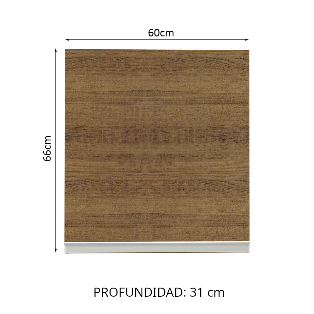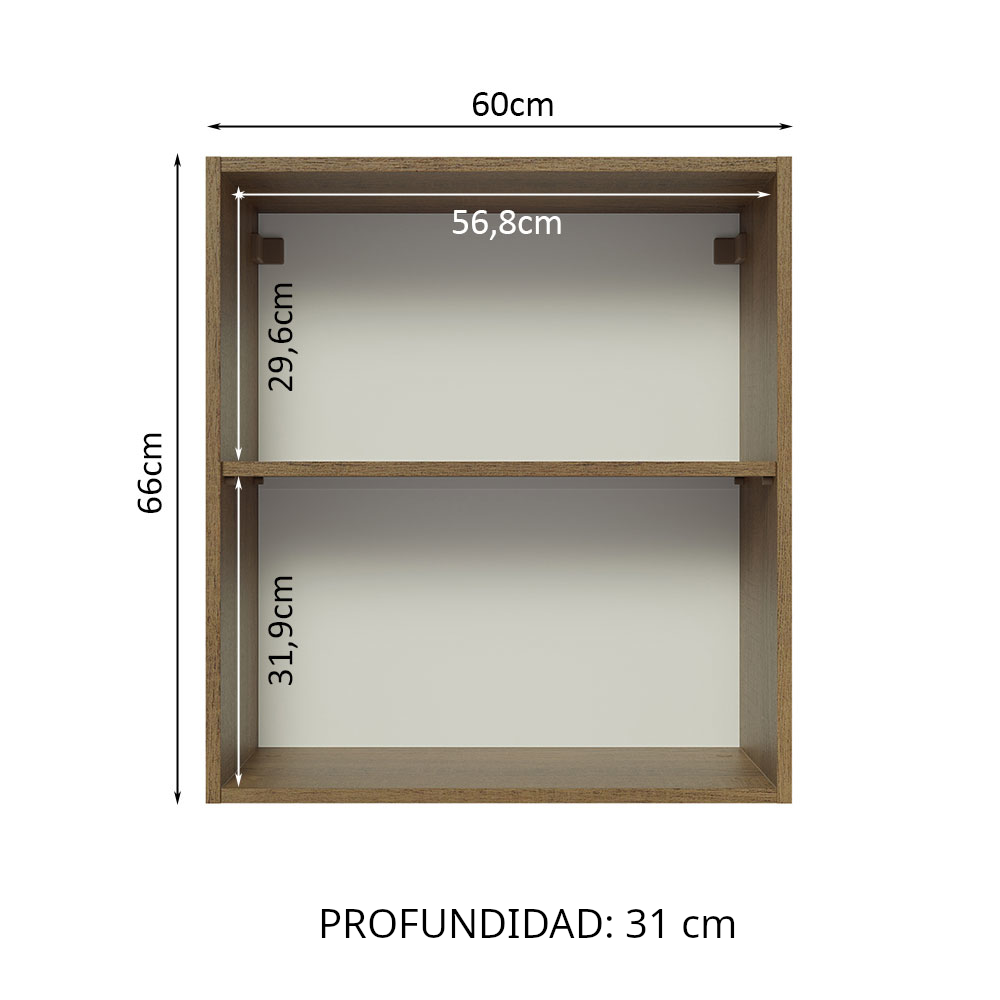 - Un (1) Gabinete Superior de 66 cm de alto x 60 cm de ancho x 31 cm de fondo con una (1) puerta y un (1) estante interior.