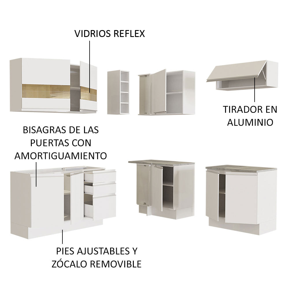 La Cocina de Esquina de la línea Glamy de Madesa esta fabricada con materiales de primera calidad, posee cajones con guías telescópicas y puertas con amortiguadores para cierre suave, además de pistón a gas para mantener la puerta abatible abierta.
