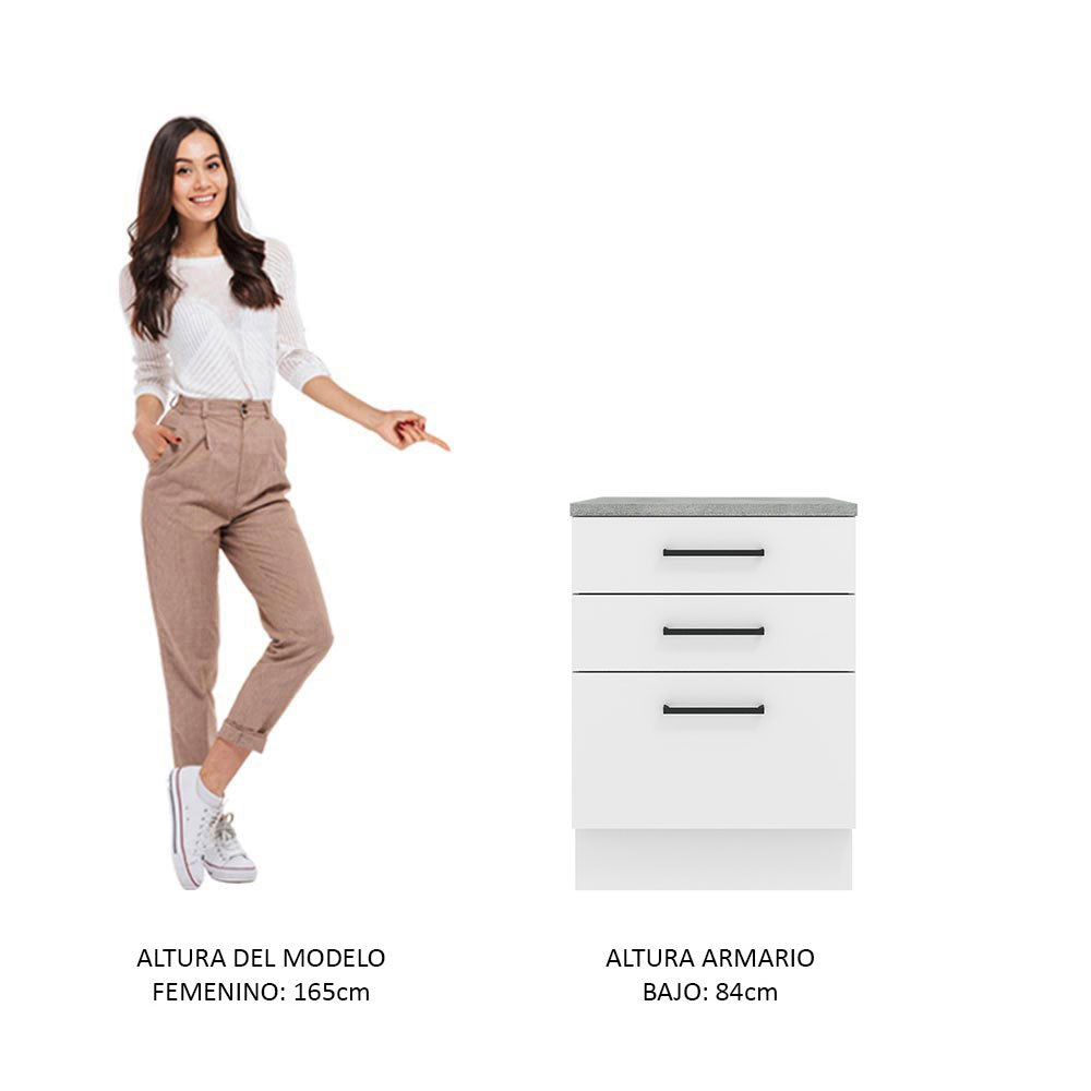 - Un (1) Gabinete Bajo de 84 cm de alto x 60 cm de ancho x 52 cm de profundidad con tres (3) cajones y encimera
