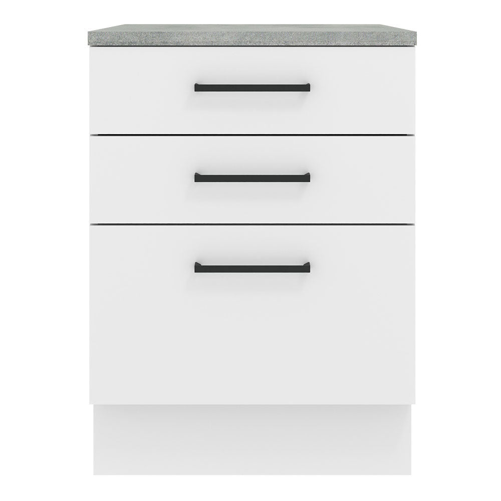 El Gabinete Bajo de 60 cm de la línea Agata de Madesa tiene tres cajones, el último de los cuales es más profundo. Es perfecto para ampliar su cocina y organizar su vajilla y utensilios.