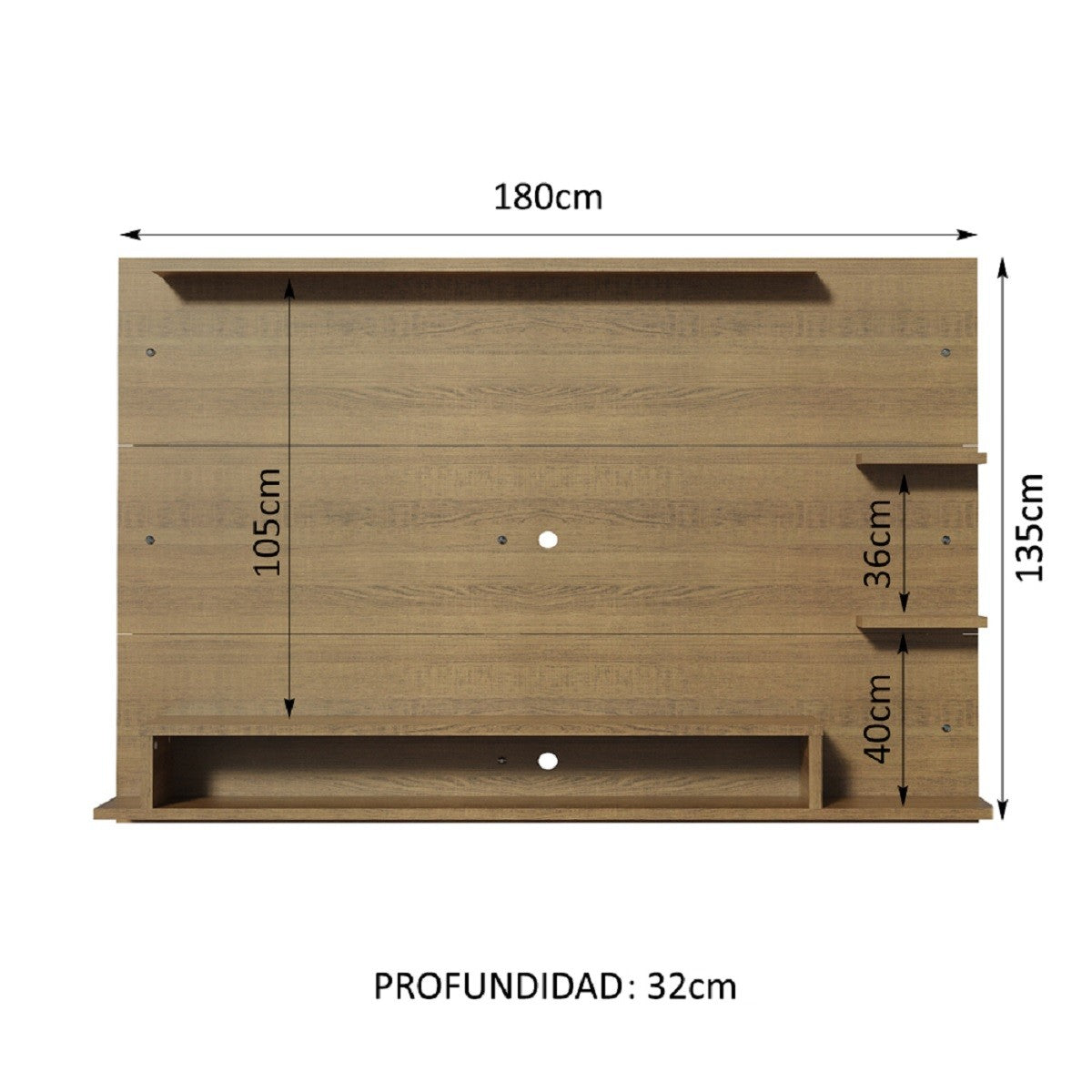 La parte inferior tiene un nicho para los dispositivos electrónicos. Además, el panel tiene dos espacios para el cableado, lo que facilita mucho la organización y deja un aspecto más limpio. Para completarlo, viene con un sistema de fijación a la pared para una instalación más segura.