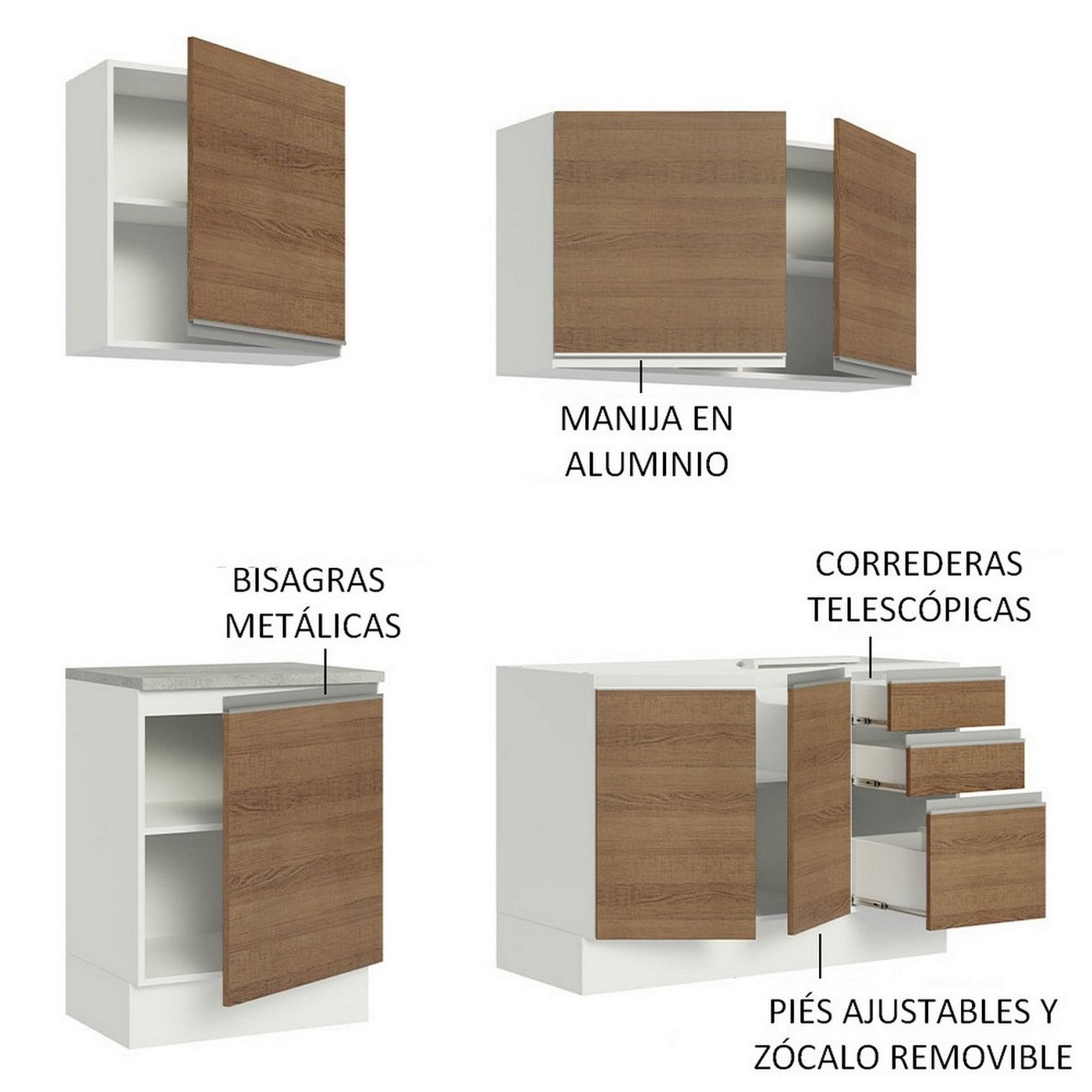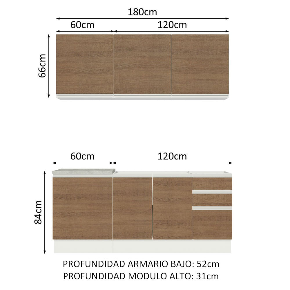 -Altura: 84 cm en los módulos bajos y 66 cm en las gabinetes superiores