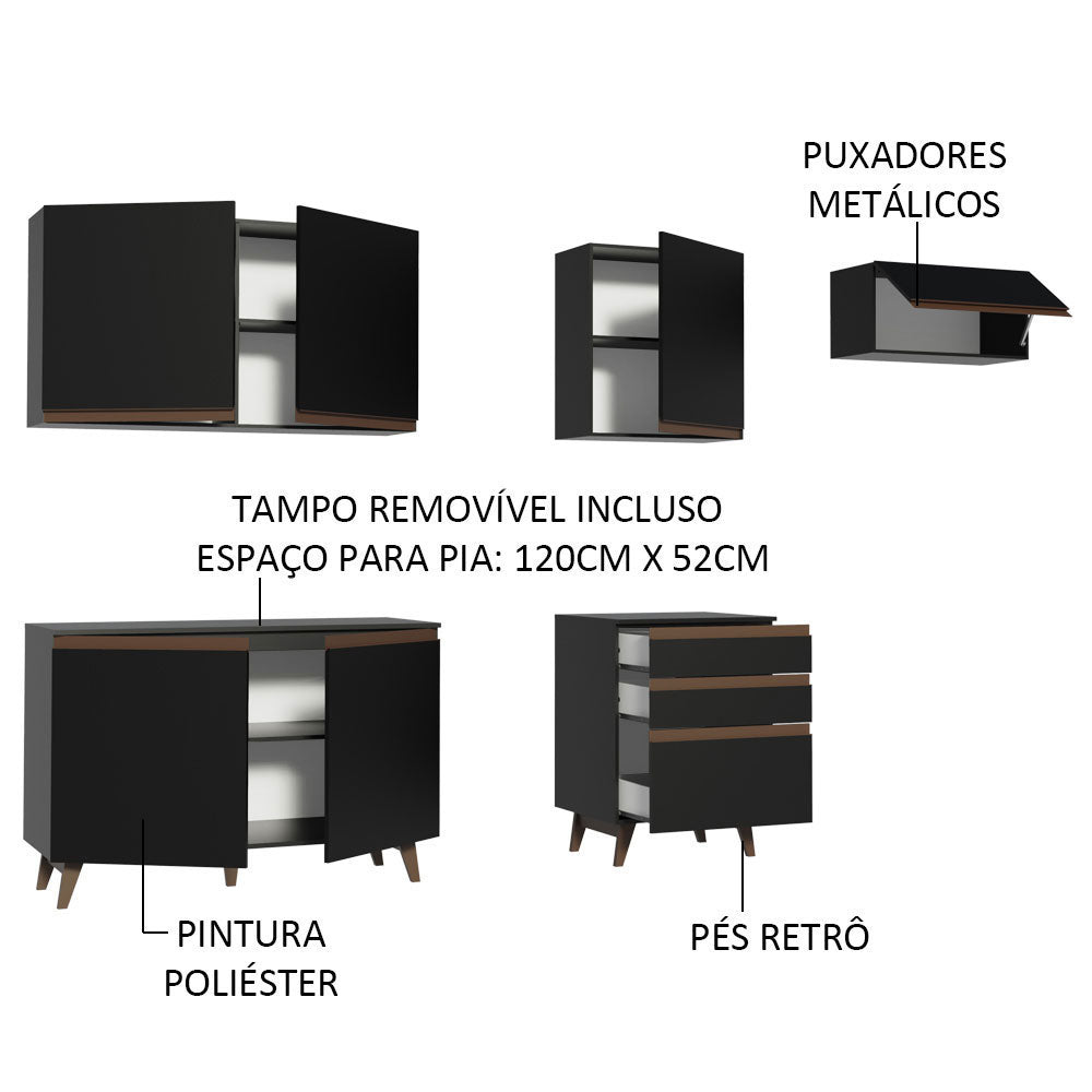 Todos los módulos son independientes y en este modelo tienes espacio para todo: ollas, platos, alimentos y lo que prefieras. Además, la encimera del mueble más grande puede ser retirada para la colocación de Mueble para tarja en el espacio de 120 x 52 cm.