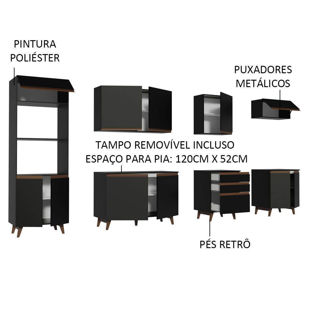 El acabado de la cocina es negro, excepto en las partes internas de los cajones y el respaldo, que son blancos. El proceso se realiza con Pintura de Poliéster ecológica de alta resistencia, lo que realza el color y protege el mueble.